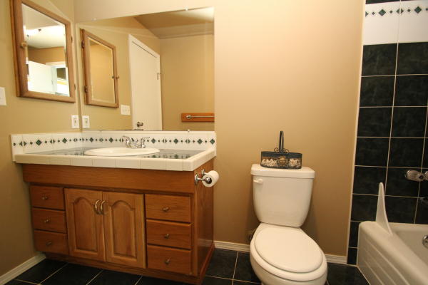 This photo of the upstairs full bathroom with soaking tub, tile counter and floor.