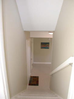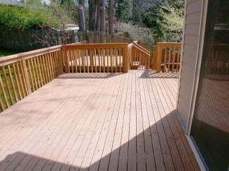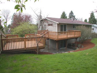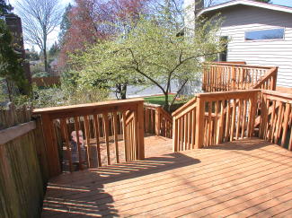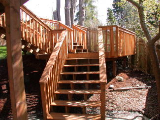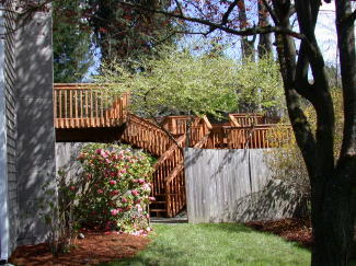 This is a descending view of one of the upper level decks leading to the lower level deck.