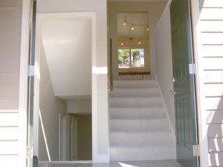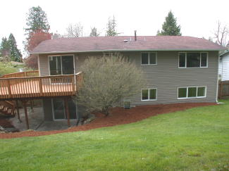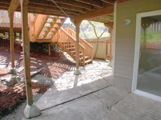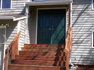 This right side, front view shows the second entrence into the back yard and the steps leading to the lower level deck and both upper level decks.