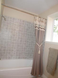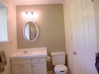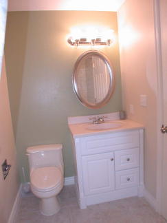 The very large lower level third bathroom with all new fixtures, sink, cabinets, mirror, lighting, toilet, ceramic tile floor and large window.