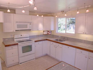 View of the new granite tile counter tops, sink, faucet, recipe book holder, custom lighting and large window.