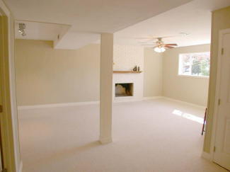 This second view of the lower level rectreation room shows the high ceiling with ceiling fan and light.