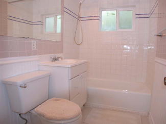 View of the full bath with vanity, mirror, tub, linen closet and window.