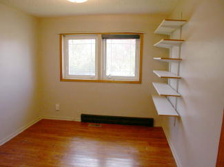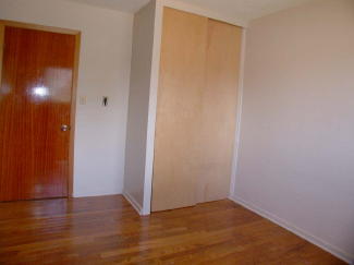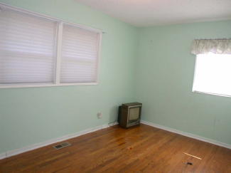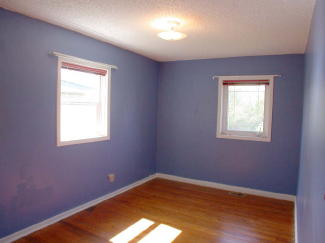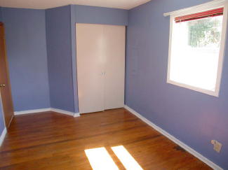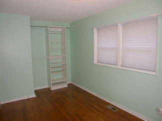 Two views of the third bedroom with hardwood floors three windows and large closet.