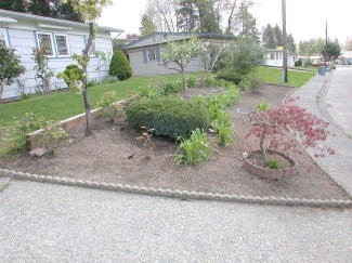 View of the lower level front yard with Cherry tree, Apple tree, Red Leaf Maple and Azaleas.