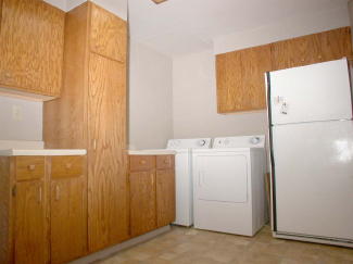 This view of the eat-in kitchen shows the additional wood cabinets, refrigerator, full size washer and dryer.