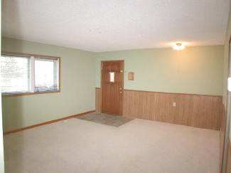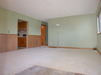 The large sunny living room has a large window and tile entry floor. Hardwood floors are under the wall-to-wall carpet.