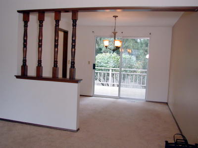 View of the large, sunny and open dinning room with sliding glass door that opens to the upper level backyard deck.