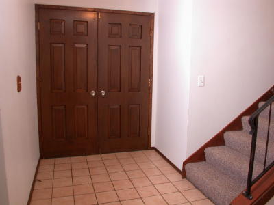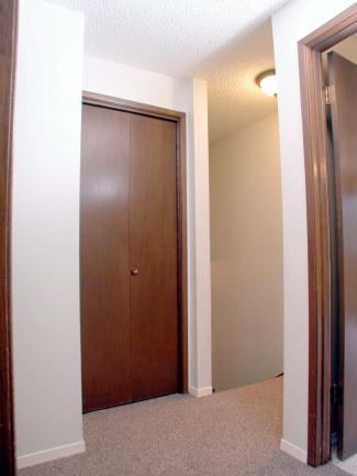 This view from the hallway leads to the upper level bed rooms and shows the large hall closet.