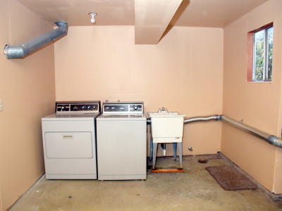 View of the plentiful work space and storage area available in the large laundry area with large utility sink and window.