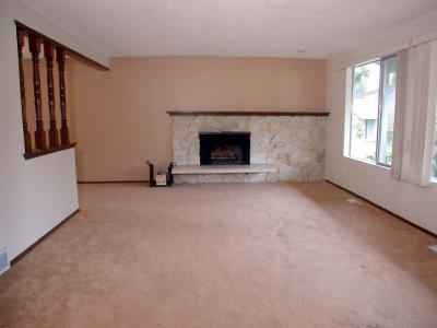 Entertain your guests in the oversized sun filled living room with two huge windows, wood burning fireplace with stone facing, stone hearth and large wood mantel.