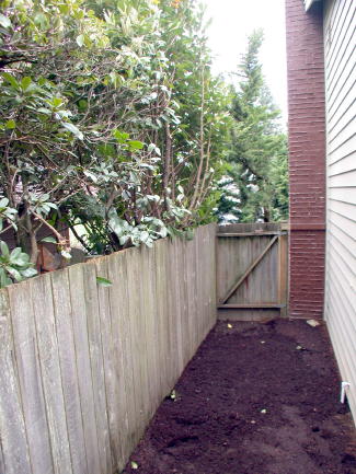 This view shows the large backyard with plenty of garden space. The side fence has a side gate to the fully fenced backyard.