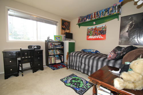 Photo of the third upper level bedroom, with large window and wall-to-wall carpeting. This room also faces south.