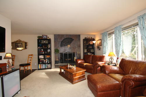 Second view of the large sunny living room. This home has updated lighting, slate floors, tile floors, wall-to-wall carpeted floors and vinyl floor.