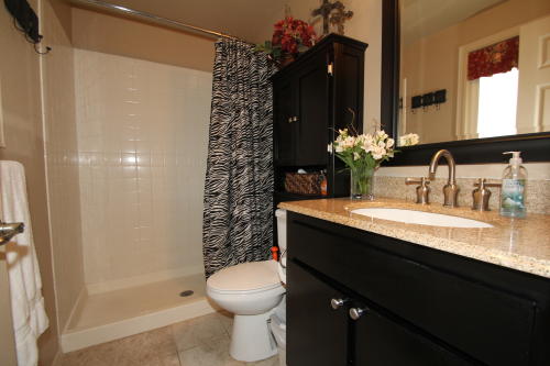 This view shows the lower level bath room shower, storage cabinets and storage closet.