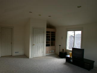 The bonus room is set up as a media/theater room with built-in component shelves.
