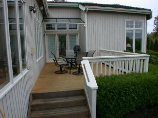 The sunny deck off the kitchen is perfect for entertaining outdoors.