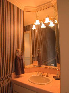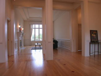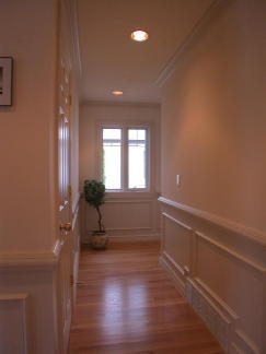 The main hall leading to the half bath and office enjoys views of the private courtyard.
