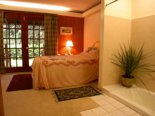 The main level guest room has a sunken tub and shower, and glass double French doors.