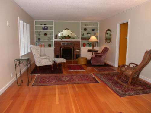 Living room has slate entry, wood burning fireplace and built-in shelves. Hardwood floors are featured throughout the house.
