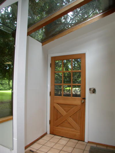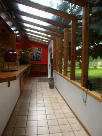 These photos show the extra long sun room with side door entry and tile floors.