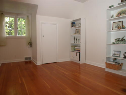 View of the upper level second bedroom with hardwood floors.