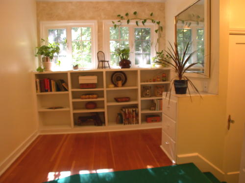 The upper level opens to the hall office space with built-in shelves and storage.