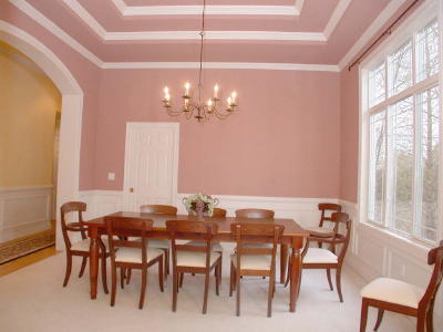 View of the large, sunny, open dinning room with huge windows, 11' high tray ceiling, wood trim and wainscoting, and easy access to kitchen.
