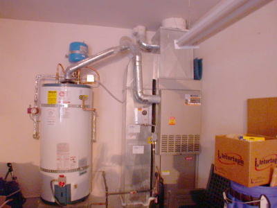 This photo shows the newer gas furnace and hot water heater located in the deep three car tandem garage.