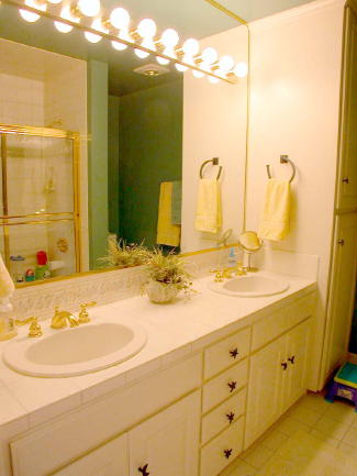 This view shows the large full second bathroom with double vanity, storage, and large mirror.