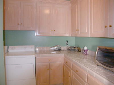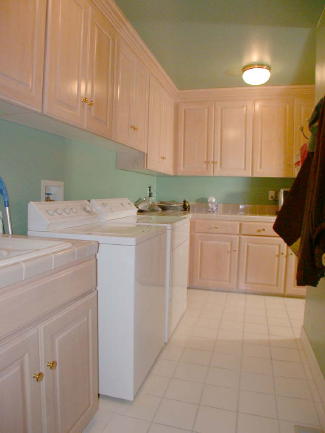 This view of the laundry room shows the large laundry sink, full size dryer and washer.