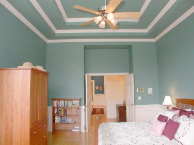 This view from the master bed room shows the hall nook past the double door entry, the 12' high tray ceiling, wood trim and wainscoting as well as the ceiling fan / light, and again hardwood floors.