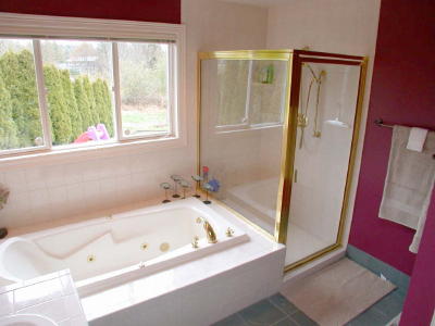 This photo shows the large jetted tub and separate shower in the master bathroom.