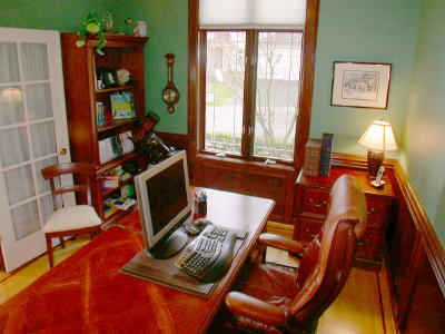 These views show the large office with built-in book shelves, 11' high tray ceilings, wainscoting and hard wood floor.