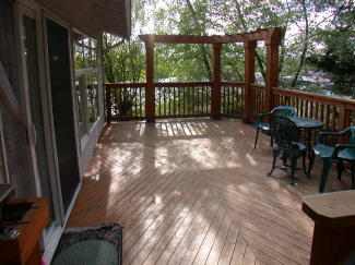 The Deck has a stairway that is open to both the walkway and the lower level Patio.