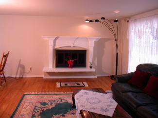 The large living room shows off the beautiful Hardwood Floors highlighted by the large Double Pane "Low E" Windows and wood burning Fireplace with large mantle.