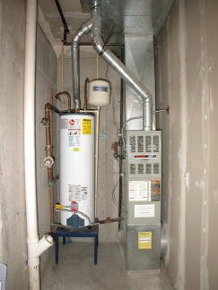 The gas furnace and gas hot water heater with over flow tank are located in an alcove located in the garage.