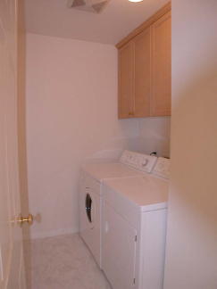 The upstairs hallway holds the sizeable walk-in laundry room with storage cabinets.