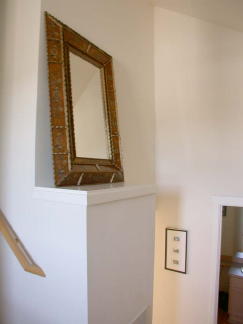 View of the upstairs full bathroom with skylight, large light sconces and mirror.