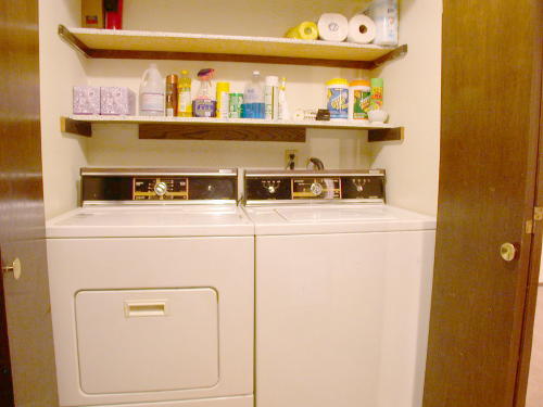 Washer & dryer stay with the home! This view shows the full sized washer and dryer in the laundry closet with top storage space.