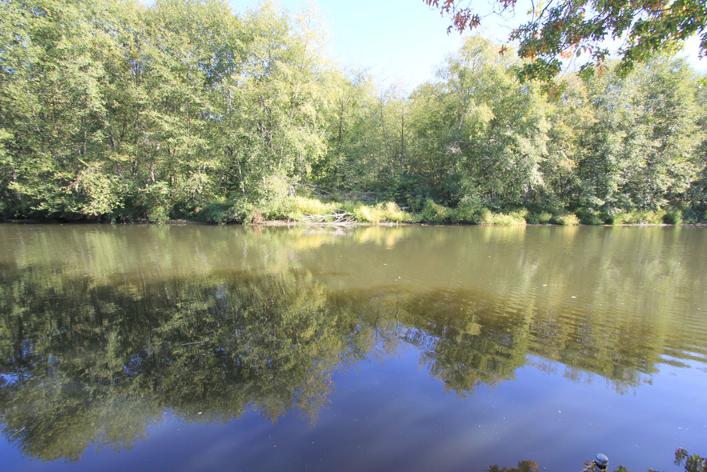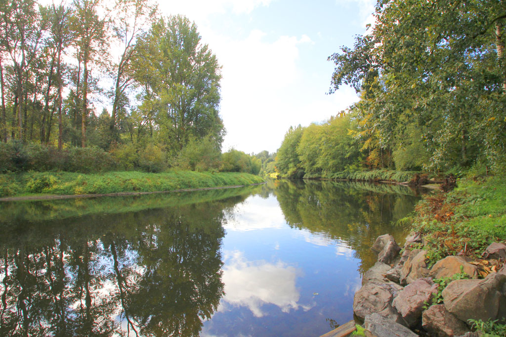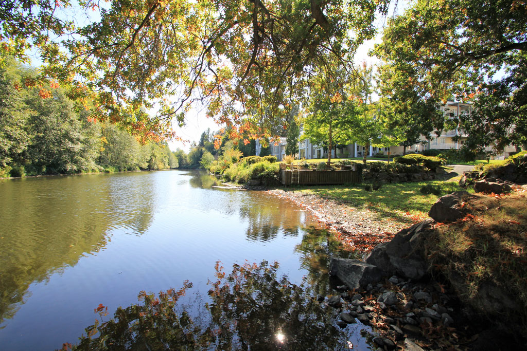 South facing view of the Sammamish River off the small boat launch at Bothell Landing Park. Riverfront Landing Condominiums are locate at the river bend.