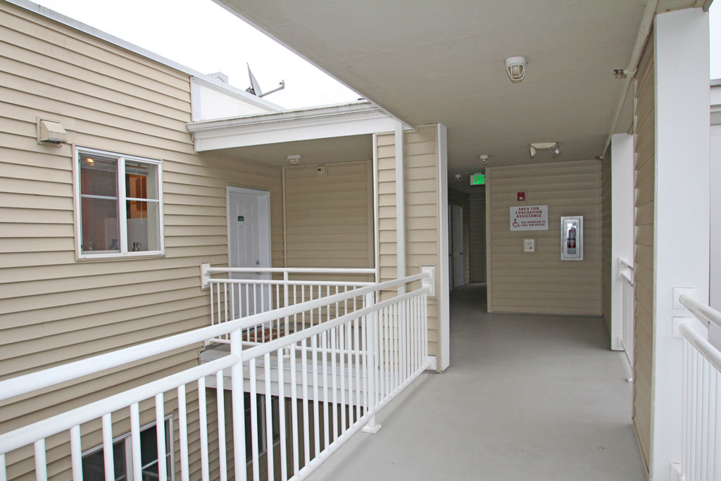 Photo of the front of building "C" with secure gated entry and covered walkways.