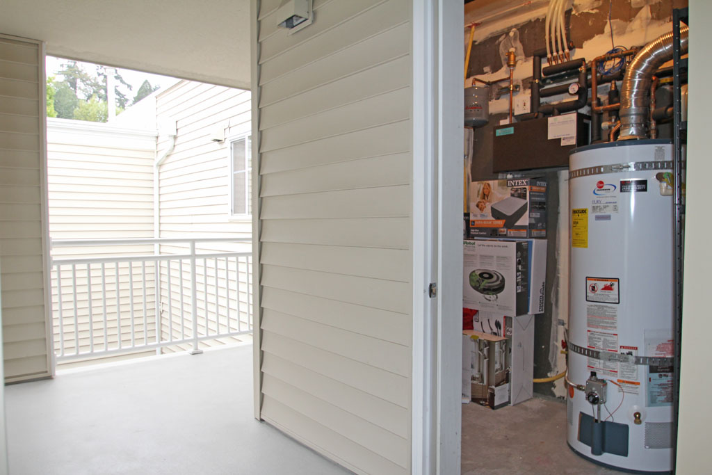 This unit has an exterior storage closet located to the right of the front door with the gas water heater with expansion tank and earthquake strapping and the new Hydronic Heating system.