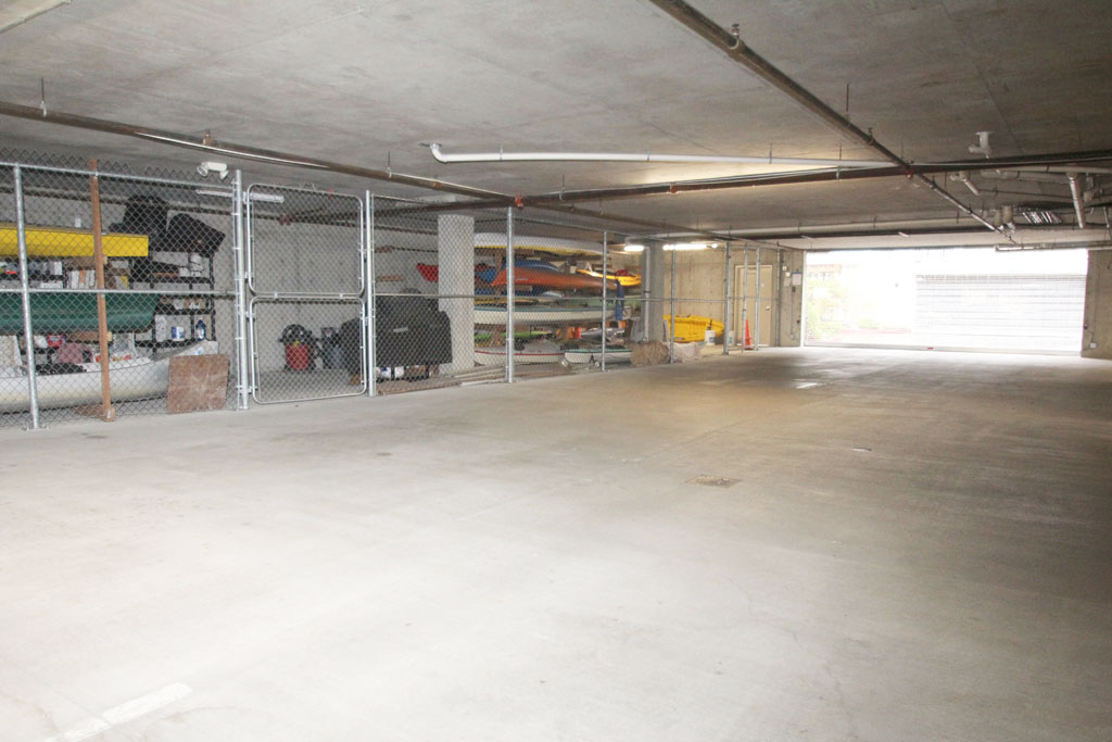A view of some of the gated storage space for kayaks and bikes in the secured basement parking in building "C".