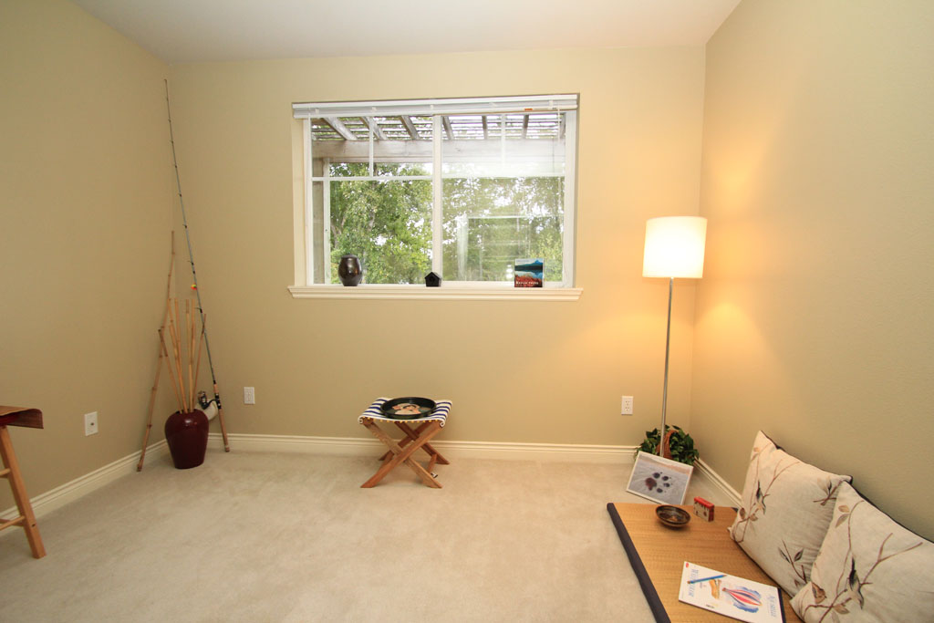 The second bedroom has a large double pane white vinyl insulated window with private back terrace views.