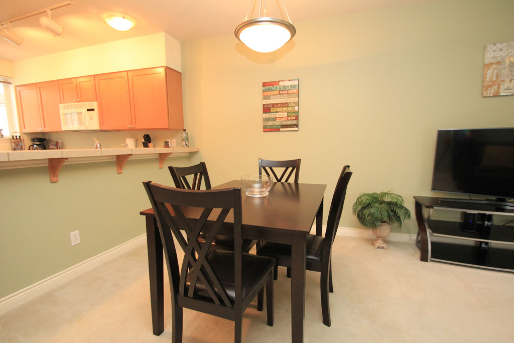 Photo of the open dining area shows the overhead lighting and wall-to-wall carpeting featured throughout.