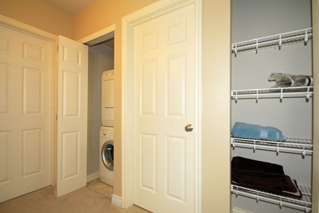 The hallway has a linen closet and a laundry closet that has a Bosh- Axxis washer and dryer and a house vent fan.