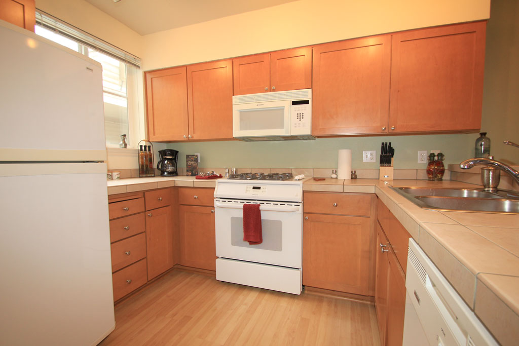 The open kitchen has ceramic tile counters and back splash, wood cabinets with lots of storage space, stainless steel double sink.