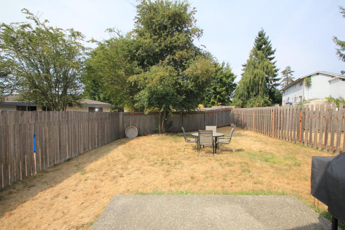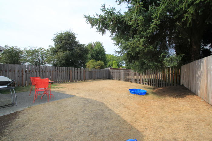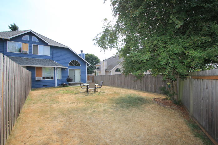 Photo of the fully fenced private back yard of unit "A" with patio and entry gate.
