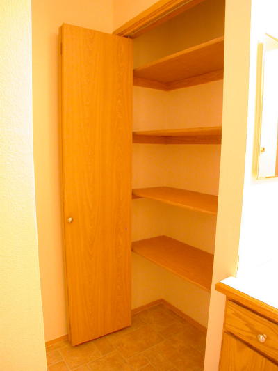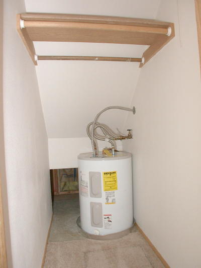 Two views of the large entry and the entry closet that houses the hot water heater, and extra storage under the stairs.